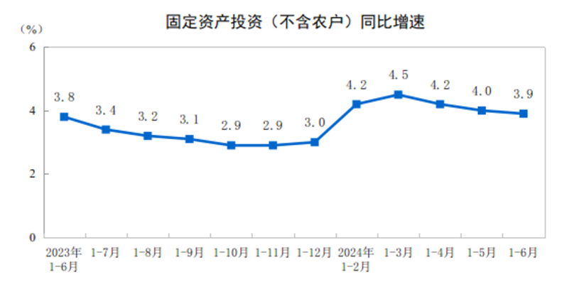 2024年1—6月份,全國(guó)固定資產(chǎn)投資(不含農(nóng)戶)245391億元,同比增長(zhǎng)3.9%。其中,民間固定資產(chǎn)投資127278億元,同比增長(zhǎng)0.1%。從環(huán)比看,6月份固定資產(chǎn)投資(不含農(nóng)戶)增長(zhǎng)0.21%。