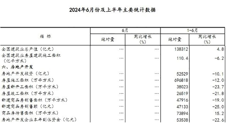 2024年上半年全國(guó)建筑業(yè)房屋建筑施工面積110.4億平方米,同比下降6.2%。全國(guó)房地產(chǎn)開發(fā)投資52529億元,同比下降10.1%。其中,房地產(chǎn)開發(fā)企業(yè)房屋施工面積696818萬平方米,同比下降12.0%。